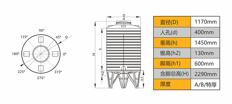 2.结构:桶身采用圆柱结构,底部椎体,美观坚固。对各类酸、碱、盐具有极佳抗腐蚀性。